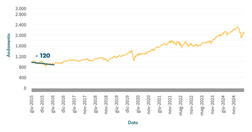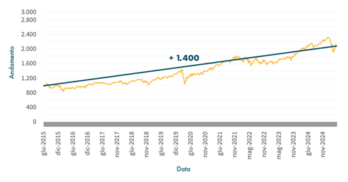 Questo grafico mostra l’andamento del prezzo delle quote che hai comprato. Passati 10 anni, hai disinvestito e le quote che nel 2015 valevano €1.000, ora valgono €2.400, quindi per ogni quota hai guadagnato €1.400. Molto bene!